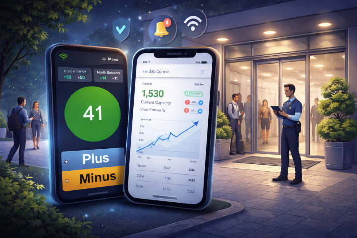 最多可在 30 台设备上同步多个客流计数器。独立跟踪每个入口,查看总占用率,启用在线客户展示,以及强大的管理和分析工具。